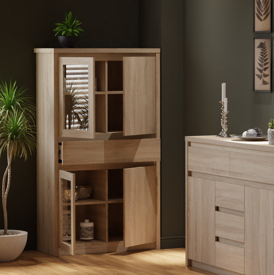 Βιτρίνα NORTON σε χρώμα SONOMA υψηλή ποιότητα κατασκευής και αντοχής. Το έπιπλο απαρτίζεται από τέσσερις ανοιγόμενες πόρτες, εκ των οποιών οι δύο γυάλινες, και τέσσερα ράφια εκ των οποιών τα δύο γυάλινα, επίσης το έπιπλο διαθέτει ένα συρτάρι για εξτρά αποθηκευτικό χώρο. Κατάλληλη για να διακοσμήσετε το σαλόνι αλλά και το υπνοδωμάτιο.
