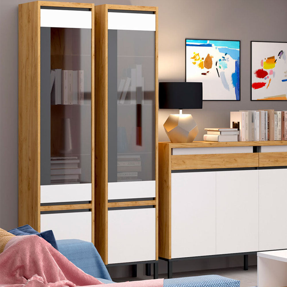 Μονόφυλλη Βιτρίνα Palmor, Ευρωπαϊκής Κατασκευής, εξαιρετικής ποιότητας και υψηλής αντοχής, σε ιδιαίτερο συνδυασμό χρωμάτων χρυσό δρυς με λευκό, και ανθρακί λεπτομέρειες.