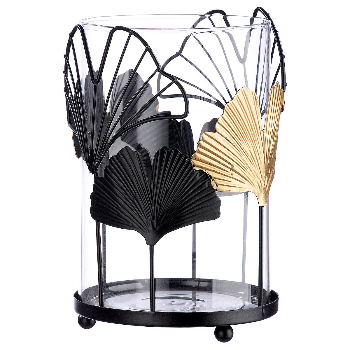 Φανάρι με Διακόσμηση Φύλλα Μαύρο/Διάφανο Μέταλλο/Γυαλί 19εκ