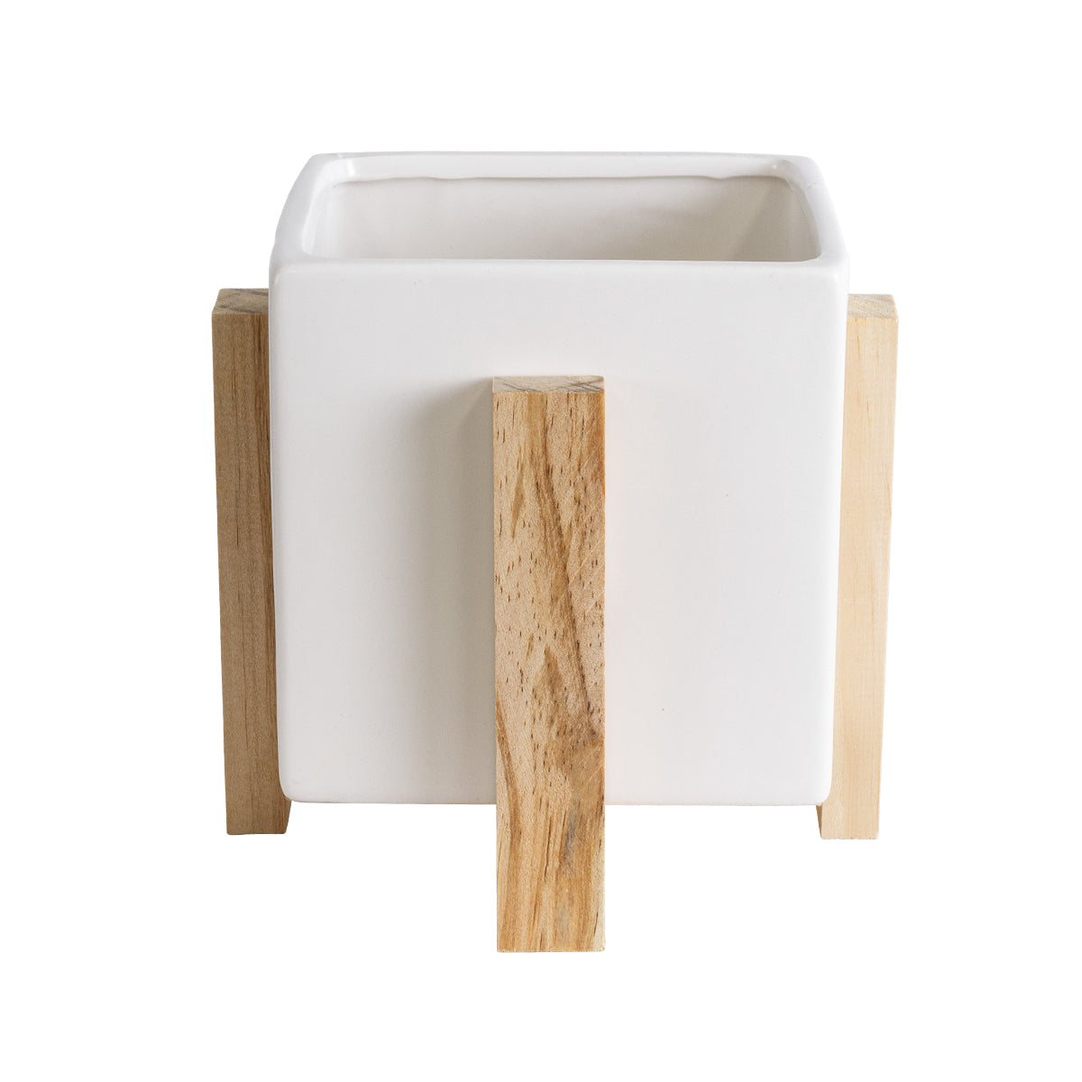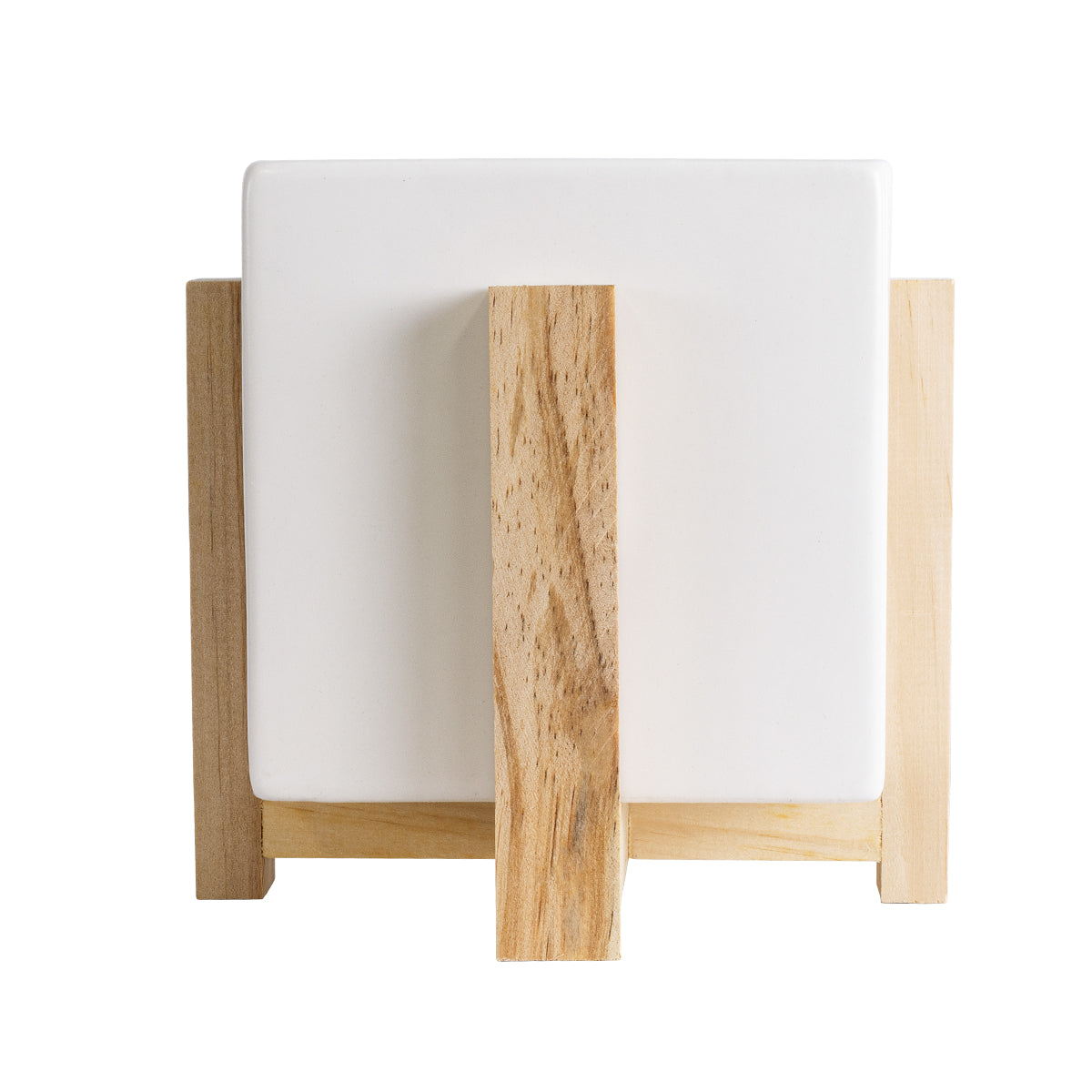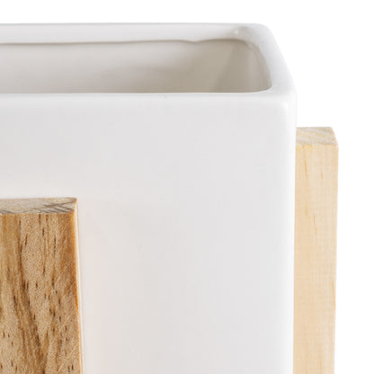 VALETA 20541 Διακοσμητικό Κεραμικό Κασπώ Γλάστρα - Flower Pot Λευκό με Μπεζ Ξύλο Φ16 x Υ16cm