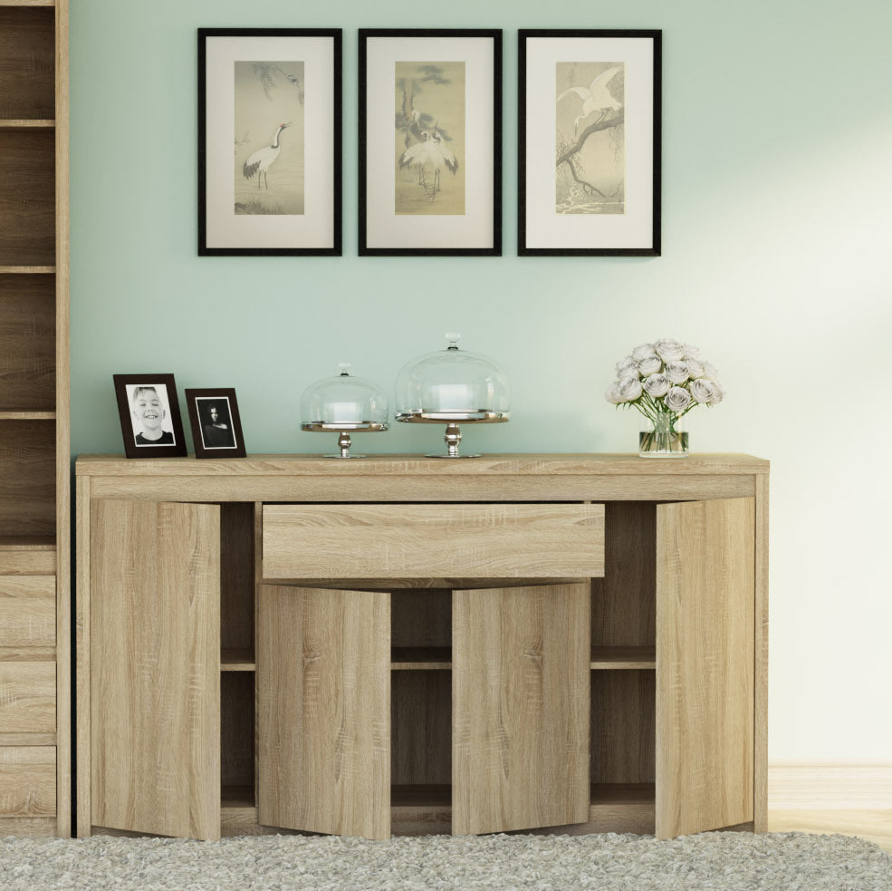Μπουφές υψηλής αντοχής και ποιότητας, σε σονόμα απόχρωση. Το έπιπλο διαθέτει τέσσερα ντουλάπια και ένα συρτάρι. Ιδανική λύση για να διακοσμήσετε και να οργανώσετε τον χώρο σας.
