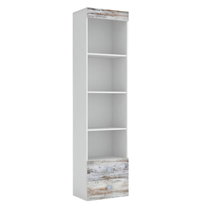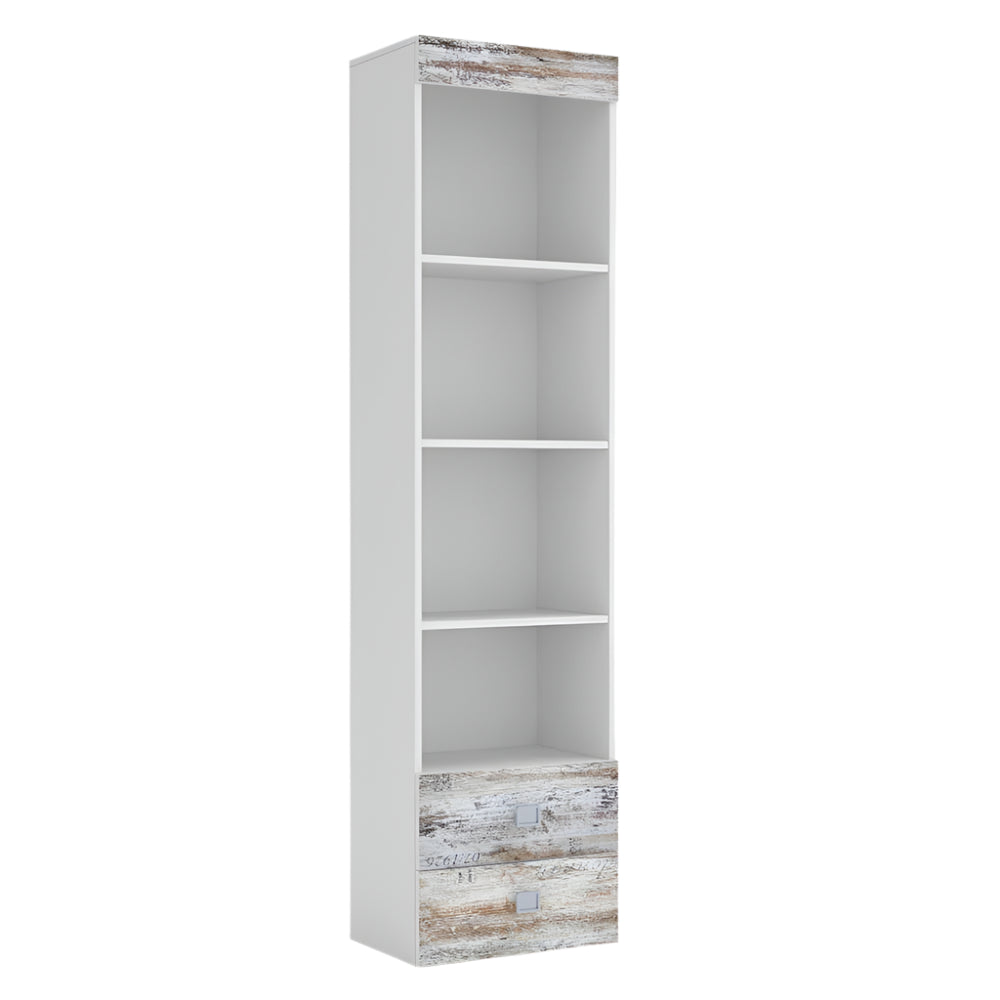 Βιβλιοθήκη υψηλής ποιότητας και αντοχής, σε λευκό-λευκό αντικέ με διακοσμητικές επιγραφές. Το έπιπλο αποτελέιται από 3 ράφια και 2 συρτάρια. Ιδανική λύση για να διακοσμήσετε τον χώρο σας ή το δωμάτιο σας, συνδιάζοντας το με την σύνθεση Pump.