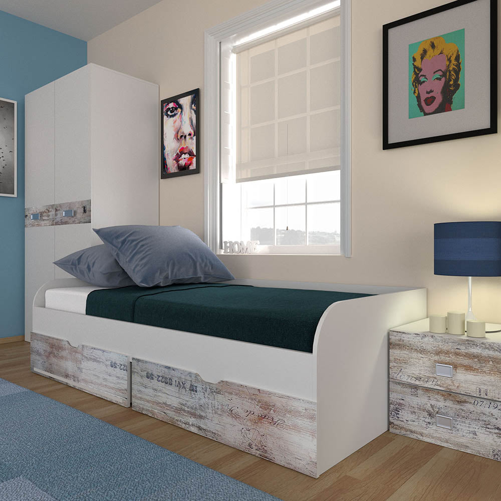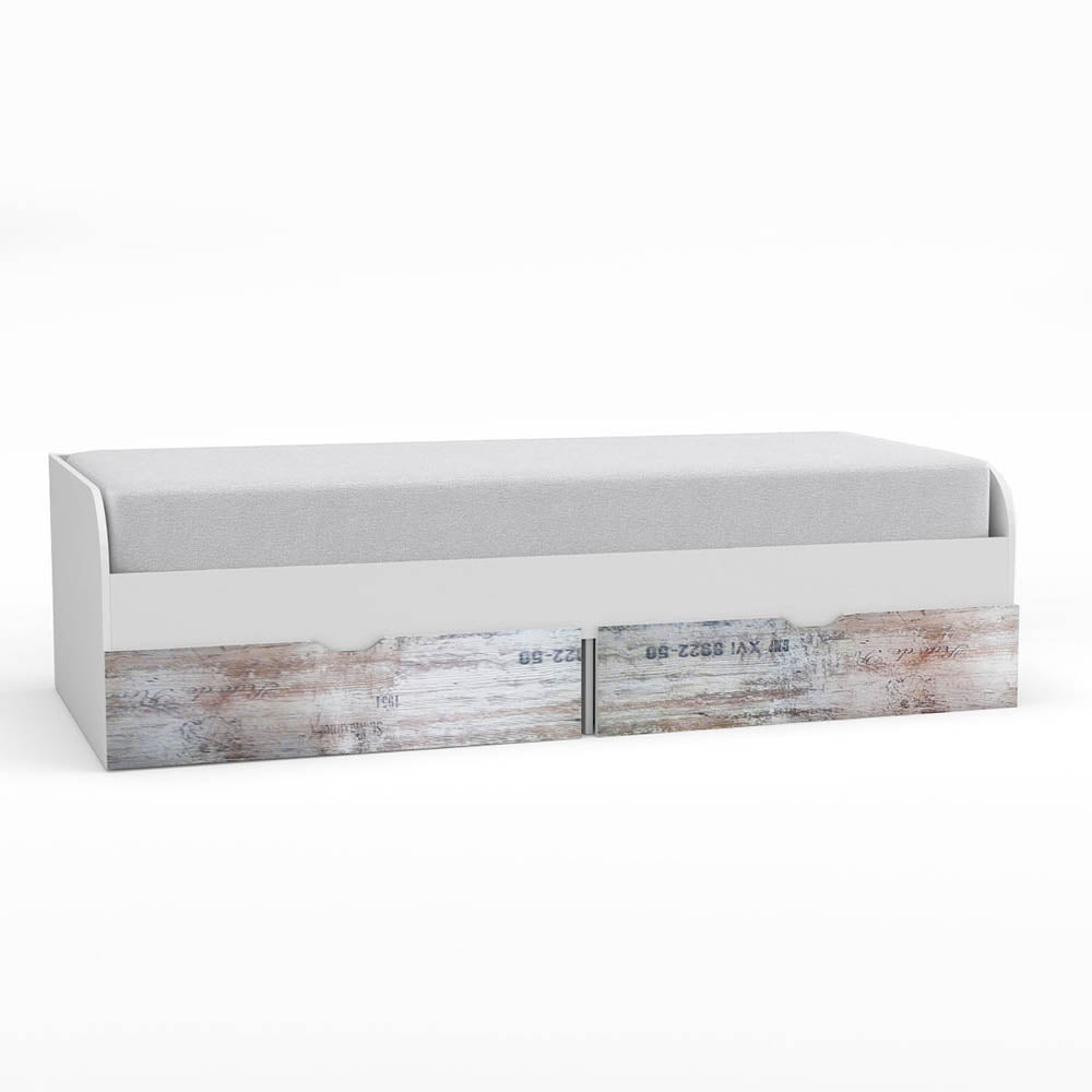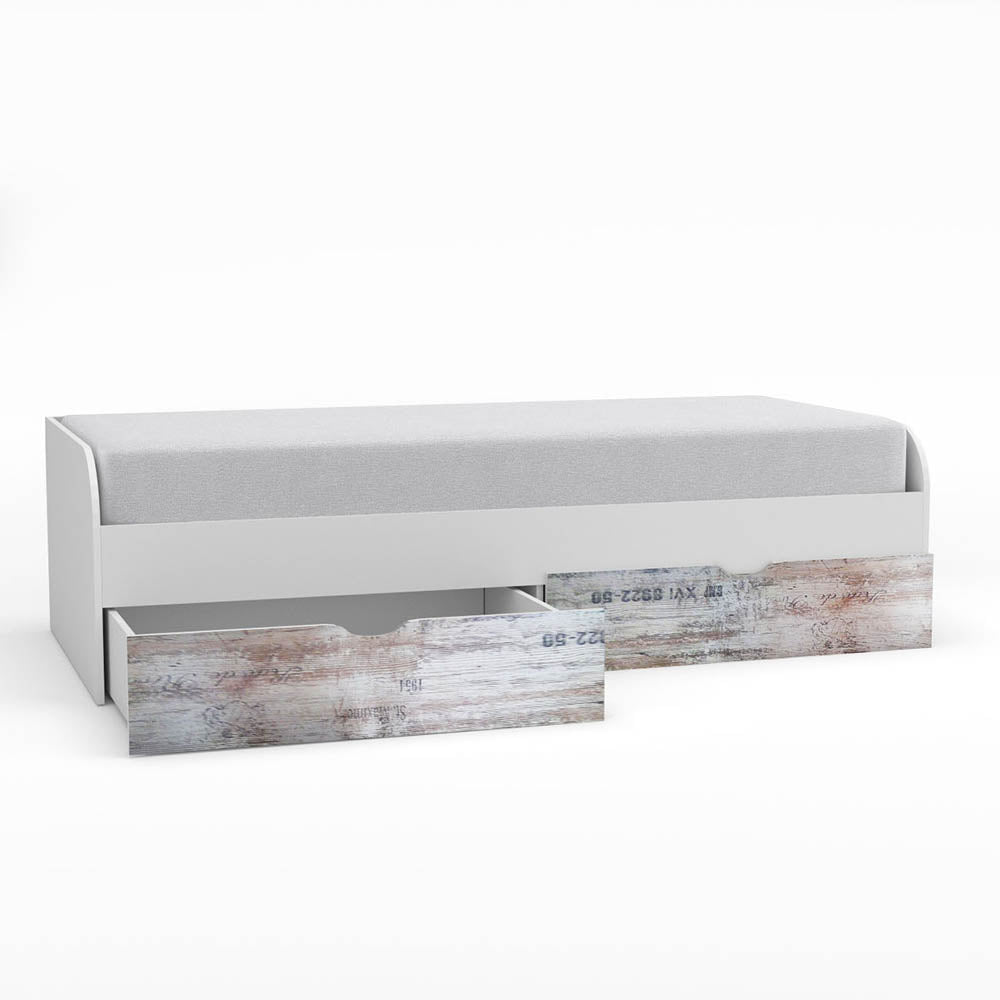Κρεβάτι Pump με 2 συρτάρια για να αποθηκεύετε είτε ρούχα είτε παιχνίδια των παιδιών σας. Δέχεται στρώμα 90x200 (το στρώμα και οι τάβλες δεν περιλαμβάνονται). Ο συνδυασμός των χρωμάτων Λευκό με Γκρί σχέδια το κάνει ιδιαίτερα ξεχωριστό και αγαπητό. Με 4 μεταλλικές γωνίες για μεγαλύτερη σταθερότητα, και μασίφ ξύλο αριστερά-δεξιά (βάση για να υποδεχθεί το πάτωμα).